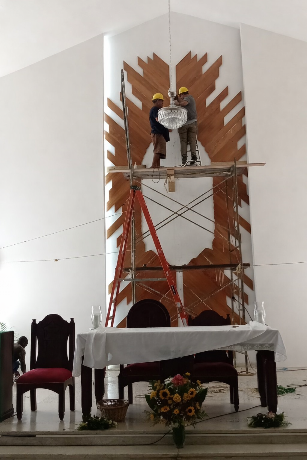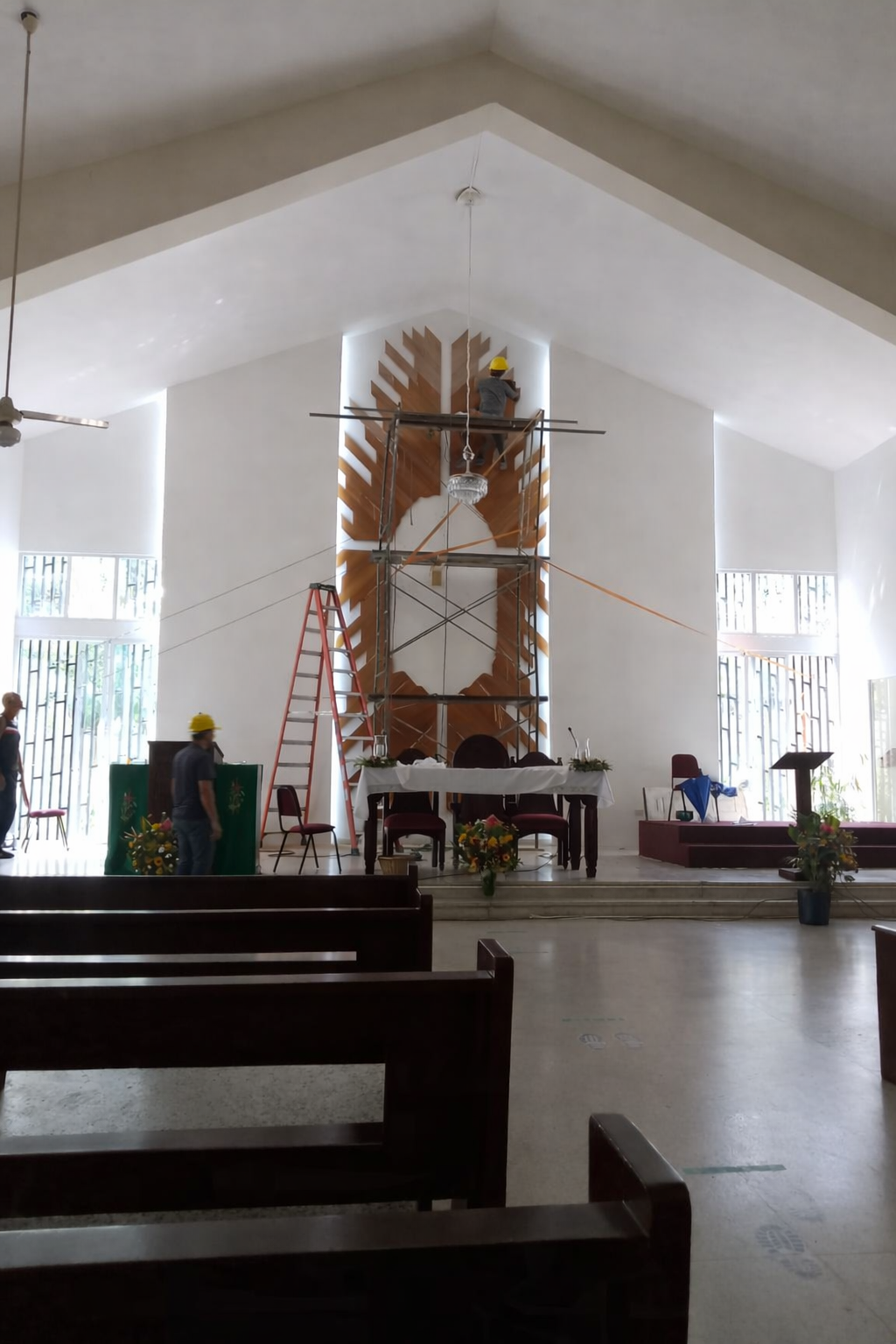 La historia cuenta que una manta iluminada, llena de flores y asociada a la Virgen, fue colocada también en la cruz de Cristo, situada en el centro del altar. Esa misma manta se utilizó para crear un aura alrededor de Cristo, mostrando cómo los elementos del altar se relacionan entre sí: la Virgen y su luz rodean y acompañan simbólicamente a su hijo, integrando ambos elementos en una misma expresión espiritual dentro del espacio del altar.