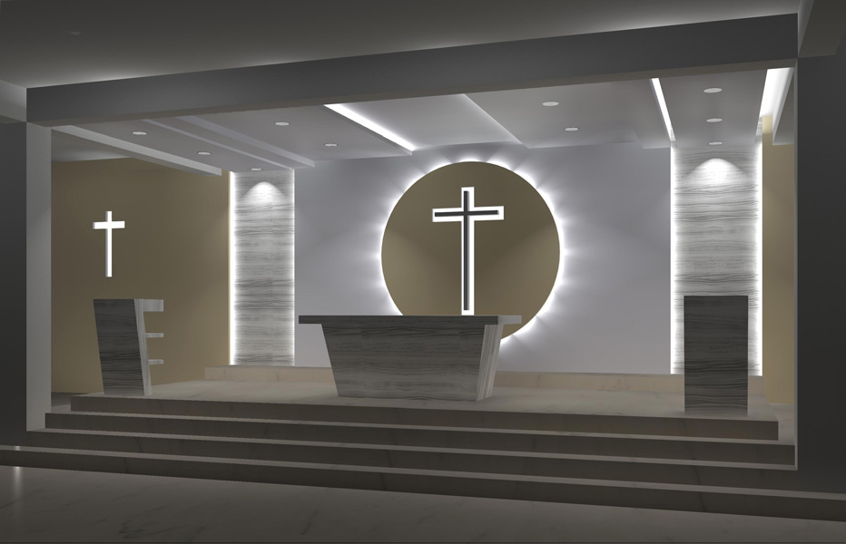 Remodelación interior moderna y expresionista, pero aún conservadora de la solemnidad de sus símbolos religiosos en la DISTINGUIDA Parroquia Inmaculada. en colaboración con el arquitecto George López.