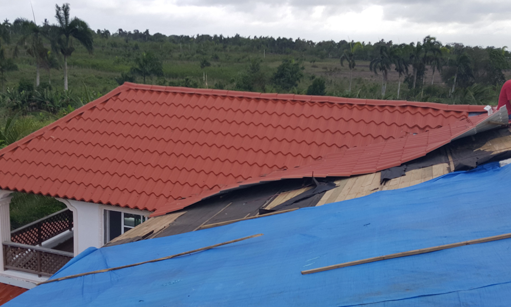 Un tornado donde casi la mitad de todas las Tejas de Aluzinc fueron desprendidas por el viento, se convirtió en el escenario de un gran reto, donde no obstante al maltrato sufrido en el Aluzinc, logramos moldear y colocar nuevamente todas las piezas originales en su lugar.