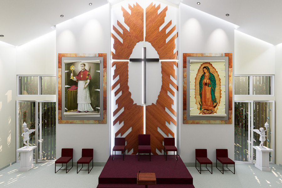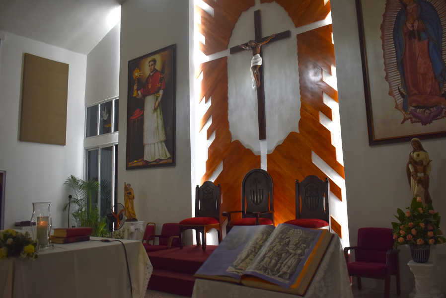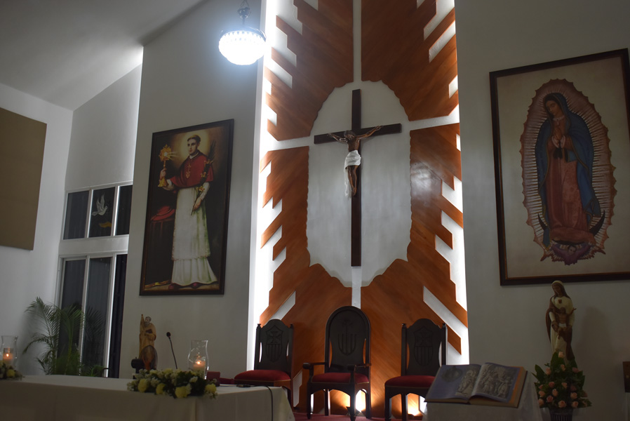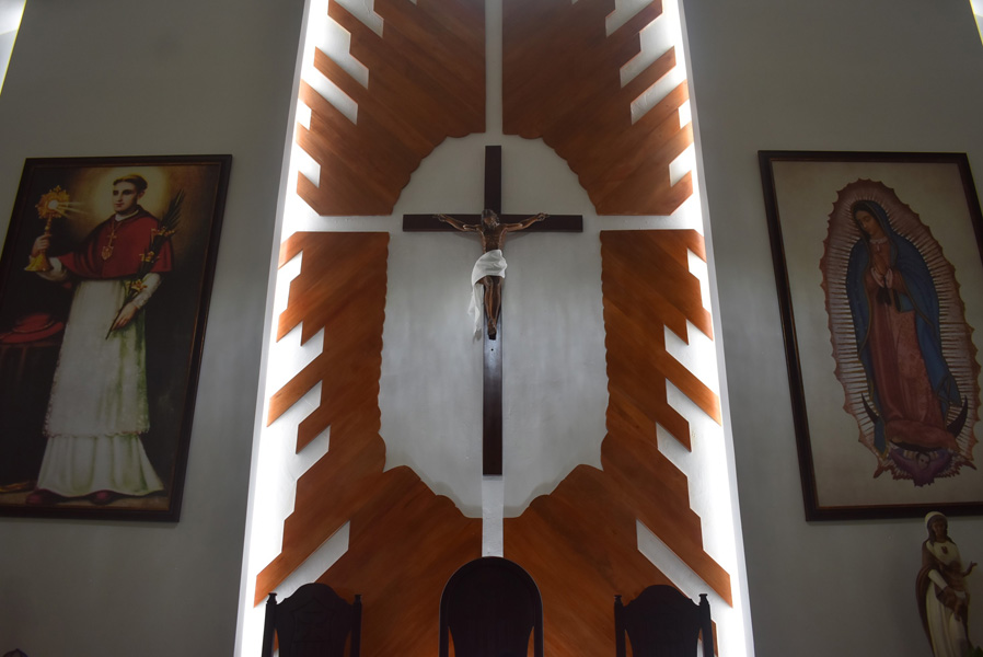La historia cuenta que una manta iluminada, llena de flores y asociada a la Virgen, fue colocada también en la cruz de Cristo, situada en el centro del altar. Esa misma manta se utilizó para crear un aura alrededor de Cristo, mostrando cómo los elementos del altar se relacionan entre sí: la Virgen y su luz rodean y acompañan simbólicamente a su hijo, integrando ambos elementos en una misma expresión espiritual dentro del espacio del altar.